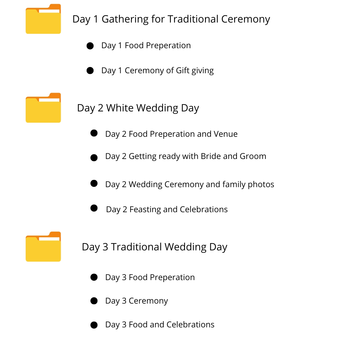 Begin with the earliest events, such as the pre-wedding preparations or parties, and follow the progress through the ceremony, reception, and any other moments that took place.