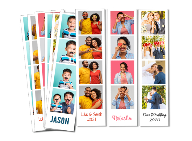 Bring the fun of the photobooth to your memories with our photobooth strips. Pick 10 of the same strip or make 10 different strips, you’ll get 4 photos per strip printed. Pop in a caption and use them to create funky save the dates or to announce that special occasion.